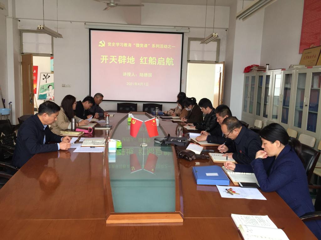 4月7日下午,公司党总支教工第一党支部在党员活动室开展学党史“微党课”活动。第一讲由公司党总支书记陆德国以《开天辟地、红船启航》为题,从“一大”的历史背景、成立的经过及历史意义等方面逐条讲述。