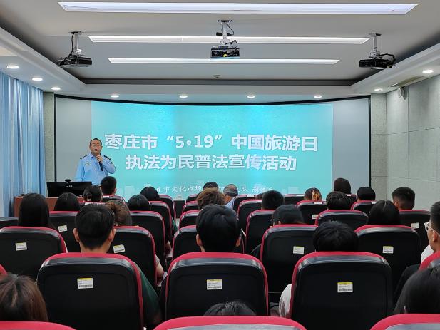 为增强旅游法治宣传教育,提高公司学子旅游安全及规范从业意识,5月19日,ladbrokes立博联合枣庄市文化市场综合执法支队于综合楼1608教室开展中国旅游日普法宣传活动。活动邀请枣庄市文化市场综合执法支队稽查四科负责人胡修岳进行专题报告,枣庄市文化市场综合执法支队副支队长、二级高级主办孙咏、枣庄市文化市场综合执法支队四级主办孙亚如、公司党总支副书记韩建敏、旅游管理专业部分教师及员工参与本次活动。