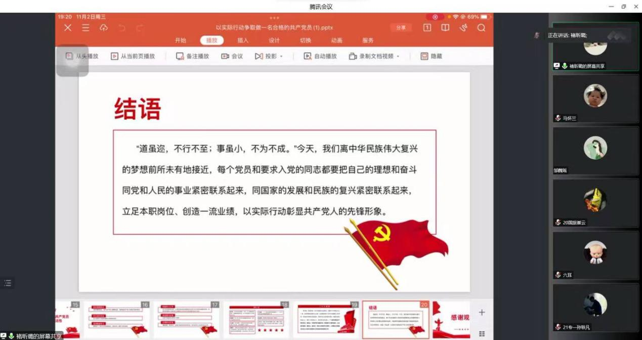 本次党课中,褚昕璐围绕申请入党的基本条件、入党积极分子教育与考察、老员工入党流程及注意事项四个方面给大家进行了详细的讲解。让入党积极分子深入了解如何在日常生活中用党员的标准要求自己,如何以实际行动向合格党员靠齐。褚昕璐建议入党积极分子在思想和行动上自觉向党中央看齐并强调要深入学习,成为有担当、有理想的新时代青年。