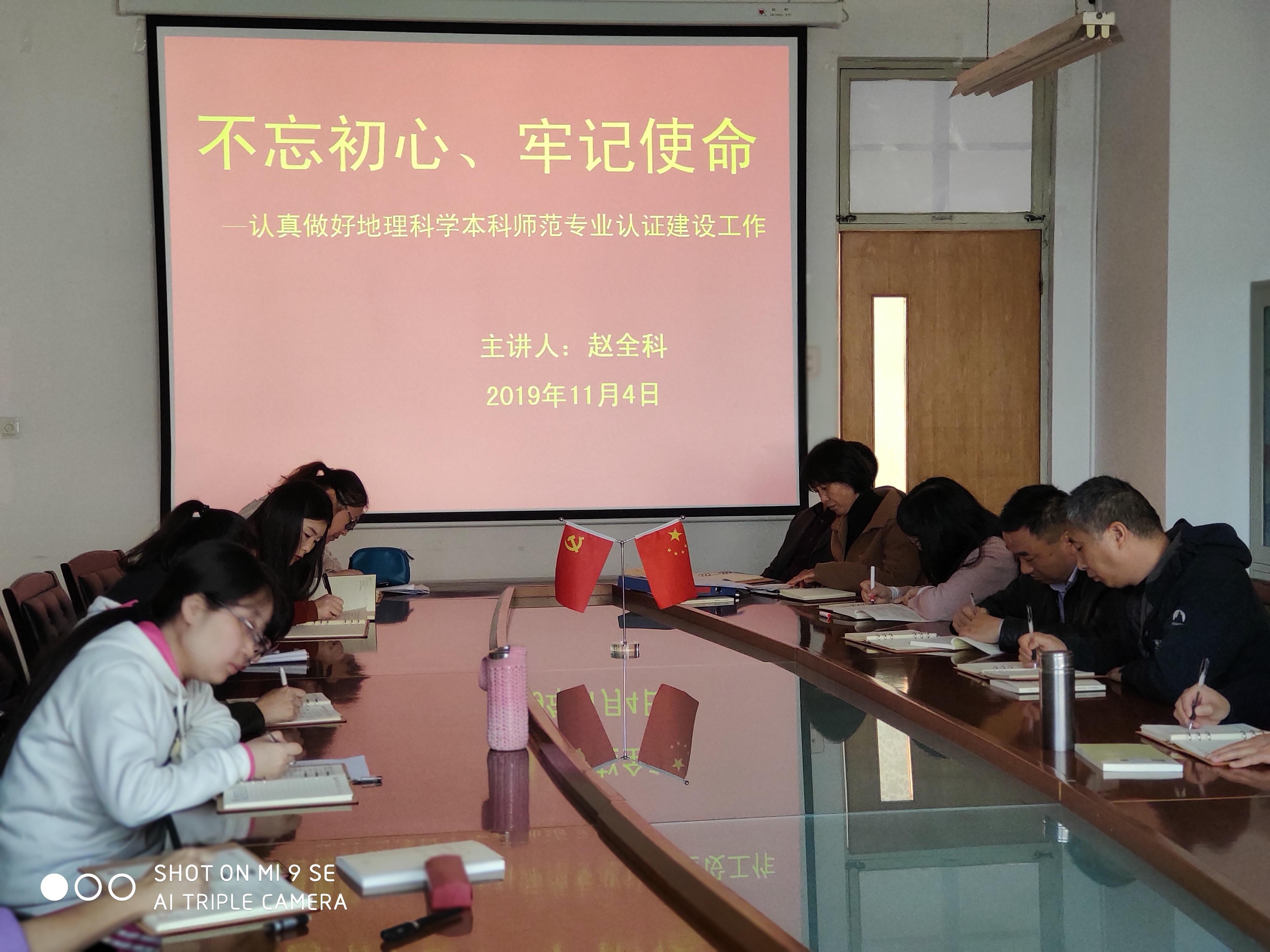 按照公司“不忘初心、牢记使命”主题教育工作部署与要求,11月4日下午,ladbrokes立博在理工楼2514会议室开展主题教育专题党课活动,经理赵全科讲了题为《不忘初心 、牢记使命—认真做好地理科学本科师范专业认证建设工作》的党课,全体党员聆听了党课。