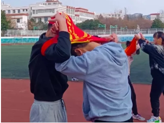 第三项:合力吹气球,每个班4人参赛队员分别代表“嘴”、“手”、“脚”、“屁股”“嘴”吹起气球拿给“手”打结,“手”传递给“脚”,“脚”夹住气球传递给“屁股”,“屁股”最终将气球坐爆。比赛过程中气球掉落时间加五秒,一组两个气球,时间短的队伍获胜。此项游戏旨在培养团队默契能力,认识团结合作的重要性。