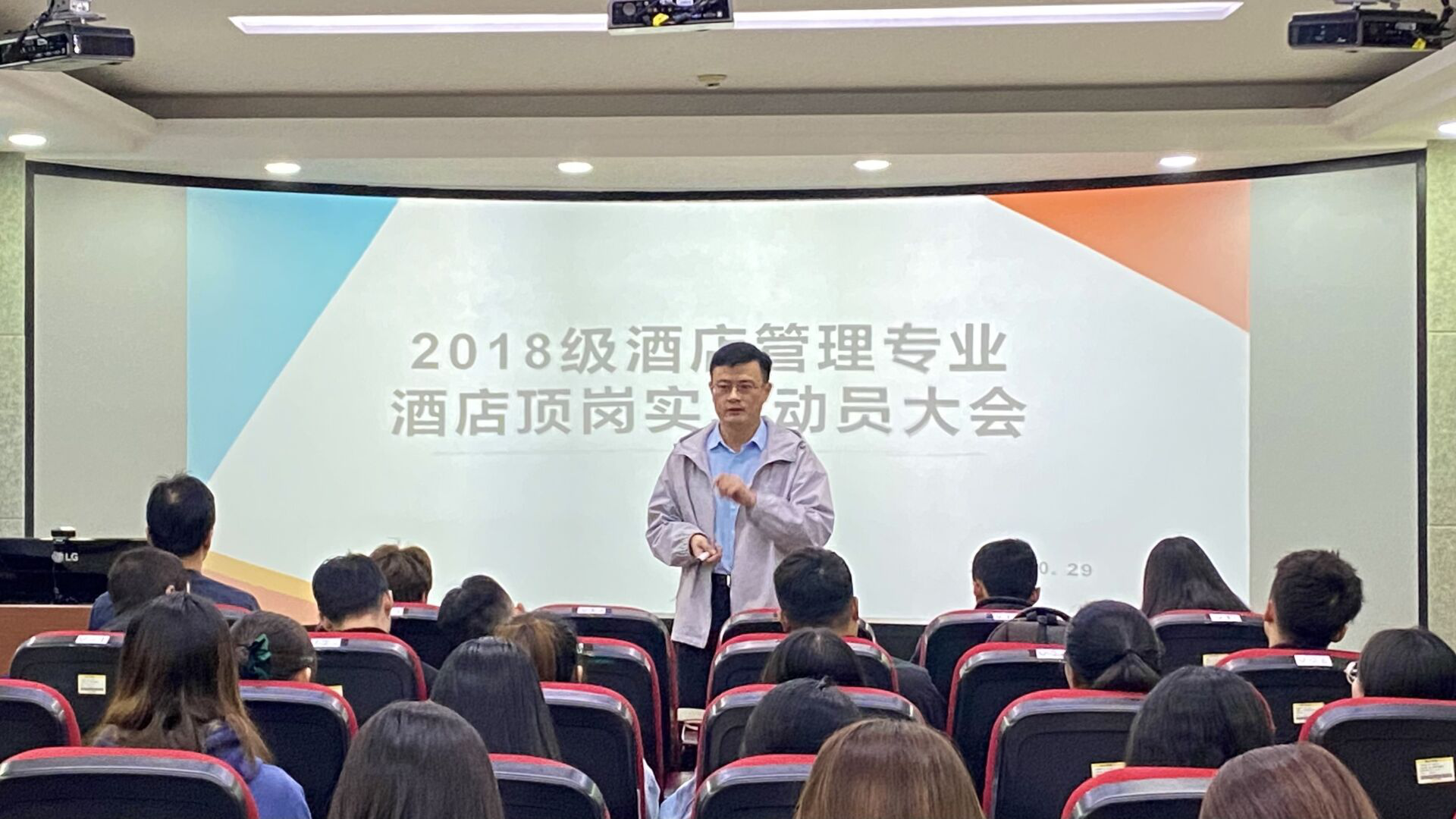 顶岗实习是应用型创新型人才培养体系中重要的教学环节,旨在提高老员工实践能力和创新能力,强化员工职业综合素养。为确保员工顶岗实习工作顺利开展,提高其对新环境、新岗位的适应能力,使同学们明确顶岗实习的重要性,10月29日下午ladbrokes立博在综合楼导游实训室召开2018级酒店管理专业顶岗实习动员会。ladbrokes立博部分教师、2018级酒店管理专业的辅导员及全体员工参加了此次会议,会议由专业负责人王文杰主持。