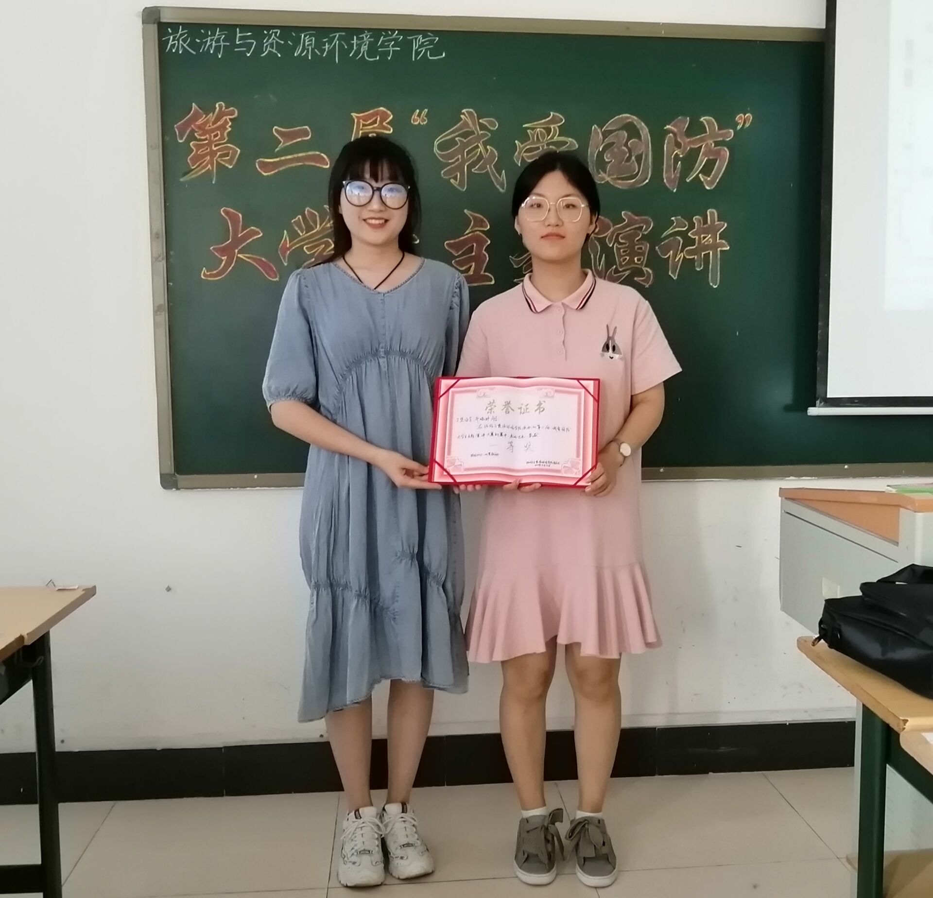 比赛中,参赛选手以“我爱国防”为主题,结合自身思想、学习情况和生活选取不同角度和方面进行演讲,或激昂慷慨,或娓娓动听,或妙语连珠,真切表达了当代老员工用青春报效祖国的使命情怀。她们富有激情、声情并茂的演讲获得台下观众的阵阵掌声。经过激烈角逐,19地理信息科学本科班的丁堃泳芳和齐晓婷获得冠军。