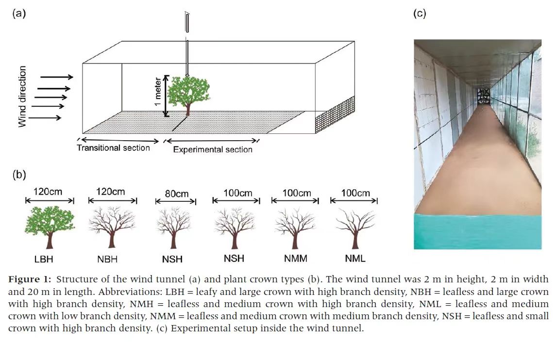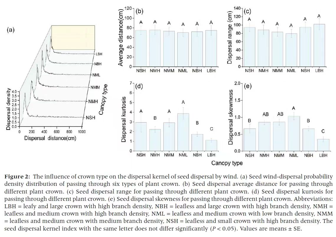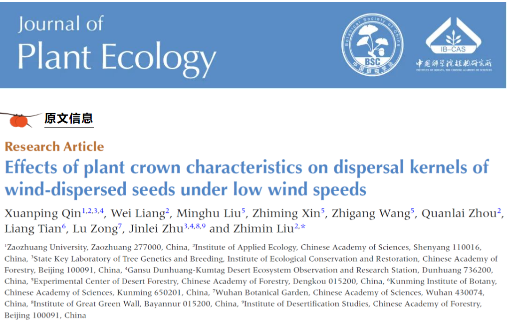 近日,ladbrokes立博黄河流域绿色发展研究中心团队在植物种子风力传播方面取得最新进展,相关工作发表在期刊《Journal of Plant Ecology》(中科院1区,TOP期刊)上,论文题目为“Effects of plant crown characteristics on dispersal kernels of wind-dispersed seeds under low wind speeds”。