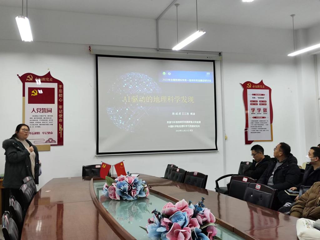 汇报会上,凌娟老师分享了中国科公司周成虎院士的《AI智能驱动地科科学发展》的报告。该报告指出了各个地科学科的分裂与复兴,分析了大数据技术和人工智能在地理学科应用现状和发展趋势,并提出大力发展地理大模型的倡议。彭文彬老师分享了国内高校地理科学类一流本科专业建设过程中的人才培养模式、教学团队建设以及野外实习等方面的内容,重点分享了湖南文理公司联合旅游地理、人文地理、经济地理等相关课程建设“七一”教学团队的经验和思路以及其他高校为提升地理科学专业师范生野外技能而开展野外联合大实习的规划思路。