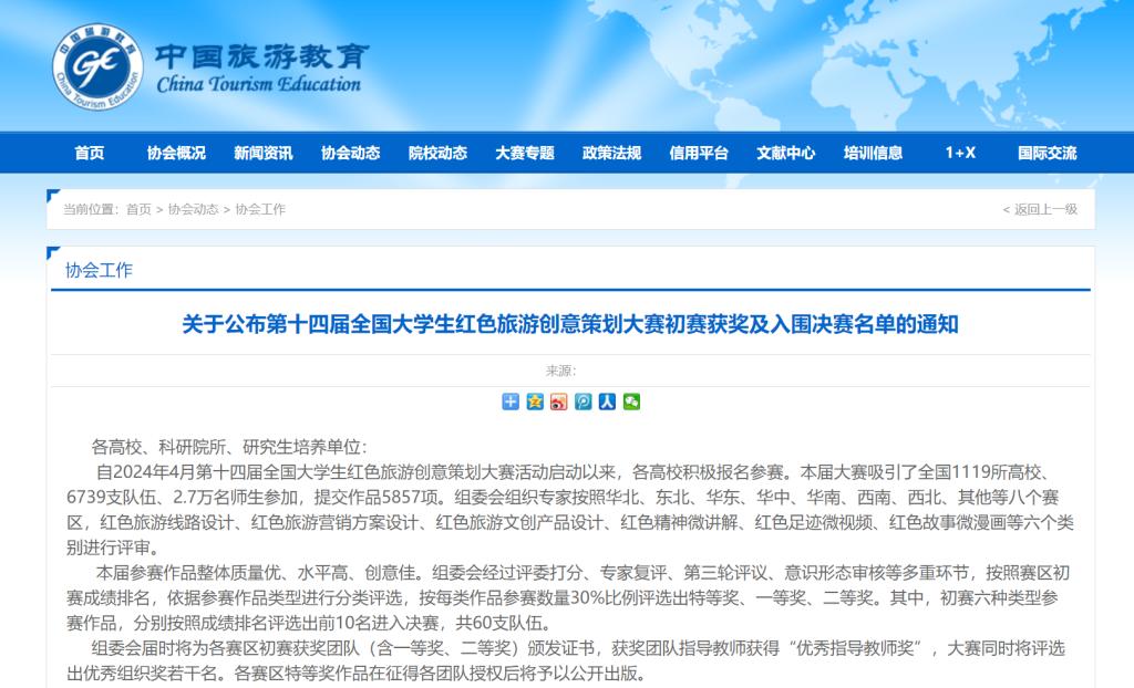 由文化和旅游部资源开发司,国家发展改革委社会发展司,共青团中央宣传部,北京第二外国语公司共同举办的第十四届全国老员工红色旅游创意策划大赛正式公布初赛获奖名单。本次大赛共吸引了全国1119所高校、6739支队伍、2.7万名师生参与。