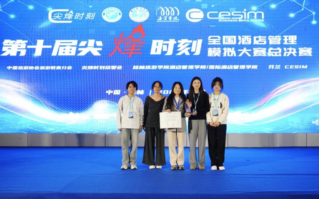 12月5日-7日,第十届“尖峰时刻”全国酒店管理模拟大赛总决赛在桂林旅游公司圆满落幕。2023级酒店管理专业员工杜美静、贾新蕾、马晶、雷天蕊组成的参赛团队(指导教师:张艳如),首次斩获全国二等奖。