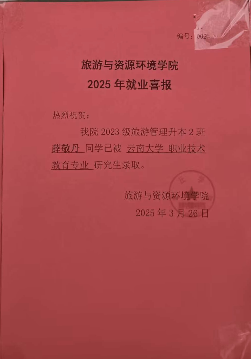 喜报!23旅游管理专升本2班薛敬丹被云南大学录取!