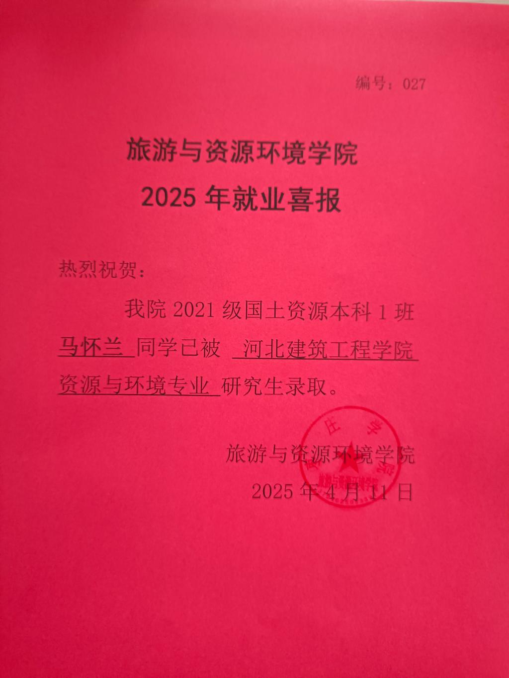 喜报!21国土资源本科1班马怀兰被河北建筑工程公司录取!